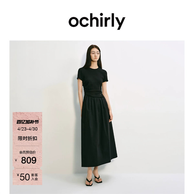 【热销补货】欧时力 连衣裙女2026夏新款褶皱短袖收腰显瘦小黑裙