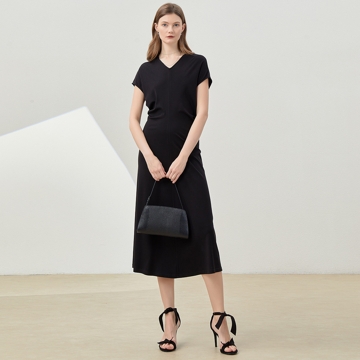 *WLQ07128 茉莉雅集 R0*W小黑裙丝滑针织棉收腰V领短袖连衣裙夏女