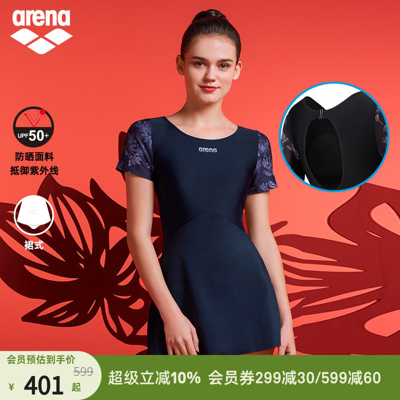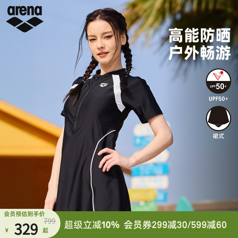 arena阿瑞娜女士运动休闲温泉度假修身遮肉小黑裙短袖连体泳衣