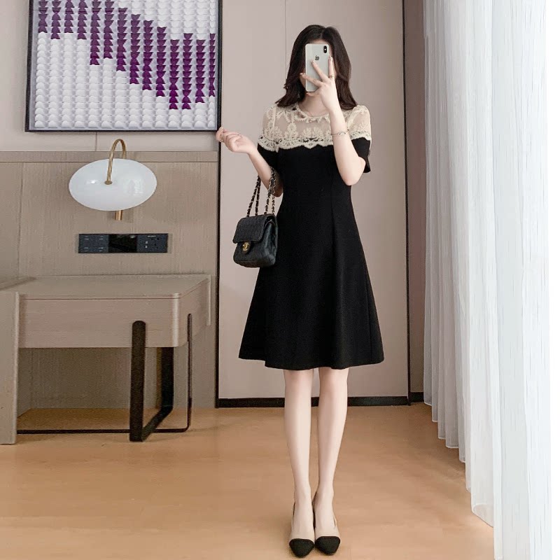 2026夏季新款法式气质小黑裙修身显瘦重工拼接短袖高级感连衣裙