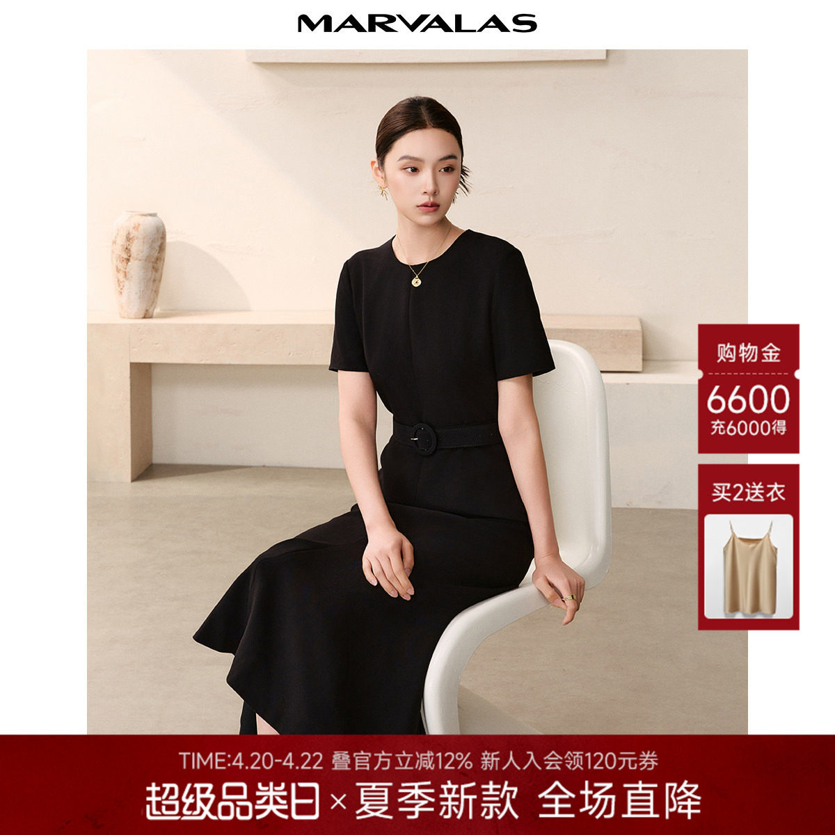 曼德诗收腰连衣裙2026春季新款纯色优雅法式鱼尾裙气质短袖小黑裙