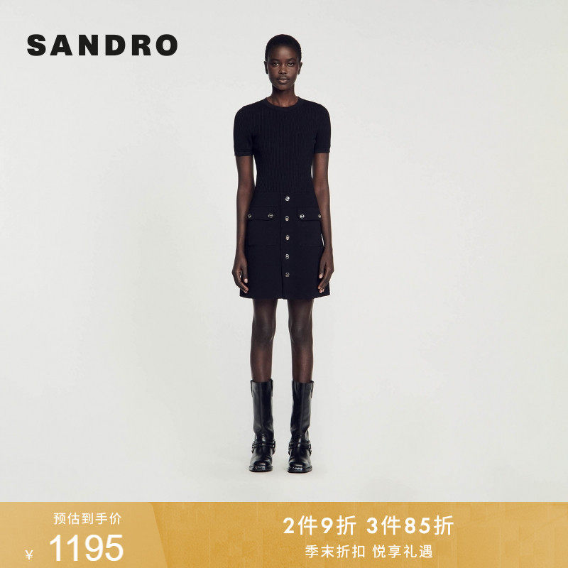 SANDRO春夏女装法式简约气质黑色高腰收腰短袖针织连衣裙小黑裙