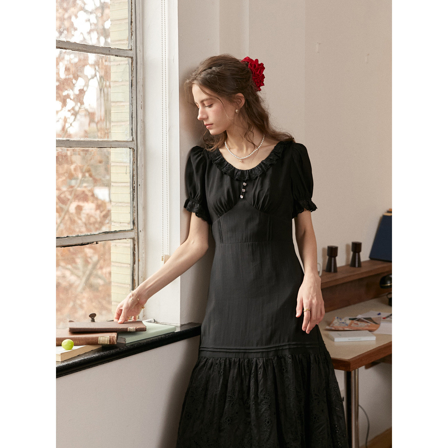 SimpleRetro法式天丝复古小黑裙刺绣荷叶边短袖连衣裙女