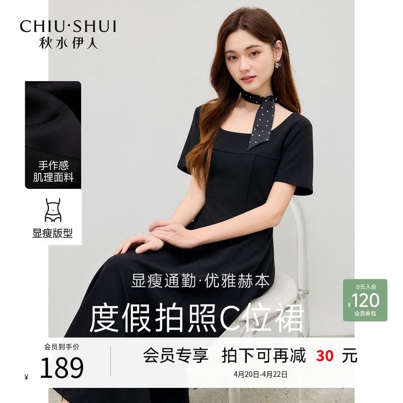 秋水伊人短袖方领连衣裙夏季新款小黑裙女装收腰赫本风黑色A字裙