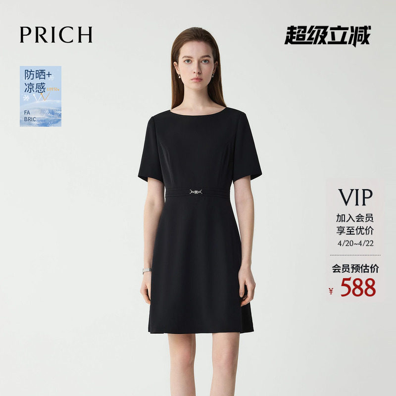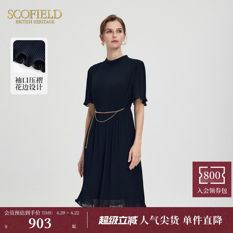 Scofield女装奢雅圆领连衣裙短袖收腰百褶裙小黑裙夏季裙子