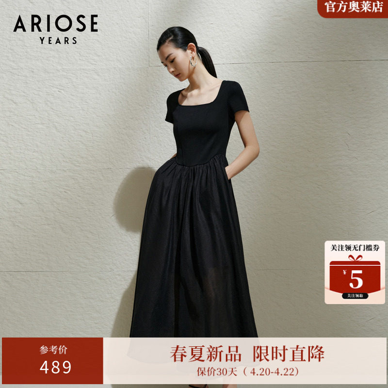 艾诺丝雅诗 天丝&亚麻方领拼接短袖连衣裙女气质小黑裙夏40439097