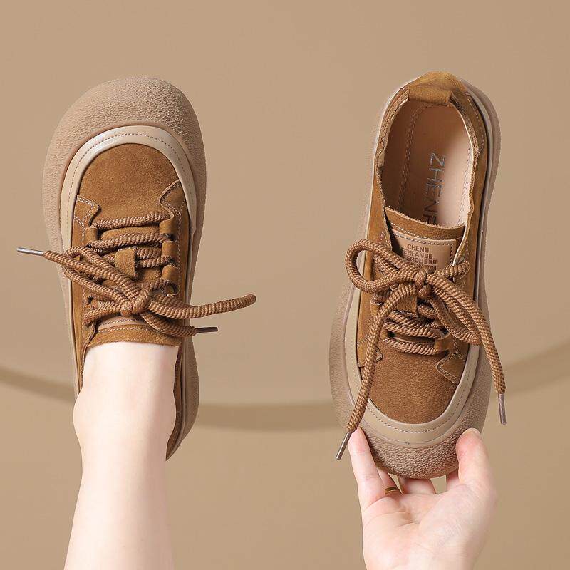 真皮厚底松糕鞋女士单鞋2025新款秋季女鞋休闲鞋子系带板鞋小皮鞋