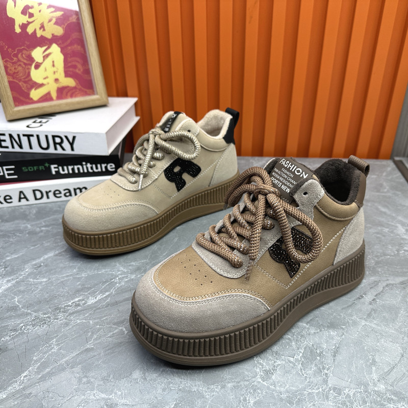 工厂断码处理真皮女鞋圆头深口系带加绒保暖增高休闲板鞋女士棉鞋