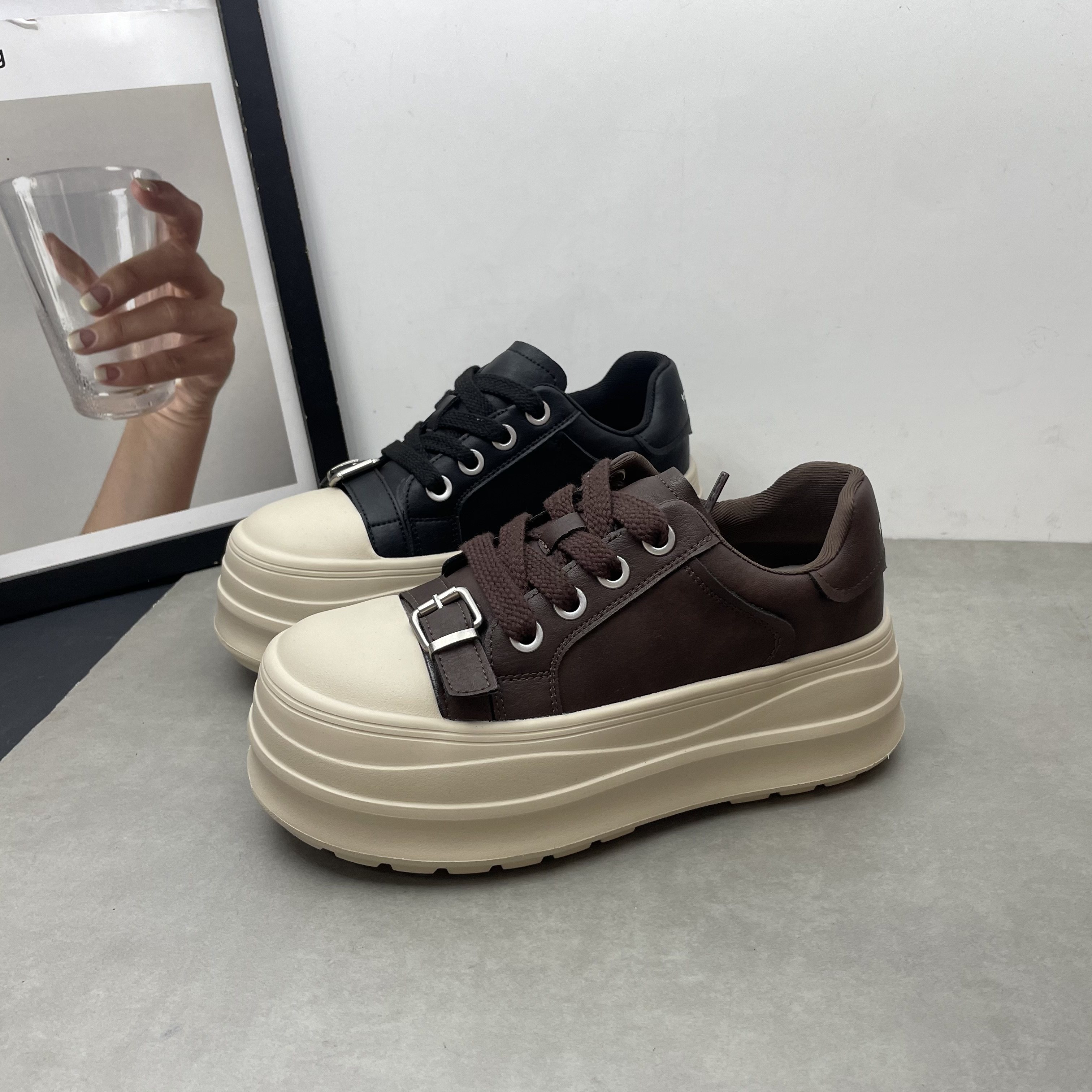 断码处理真皮圆头系带厚底板鞋女2024秋季新款拼色百搭女式休闲鞋