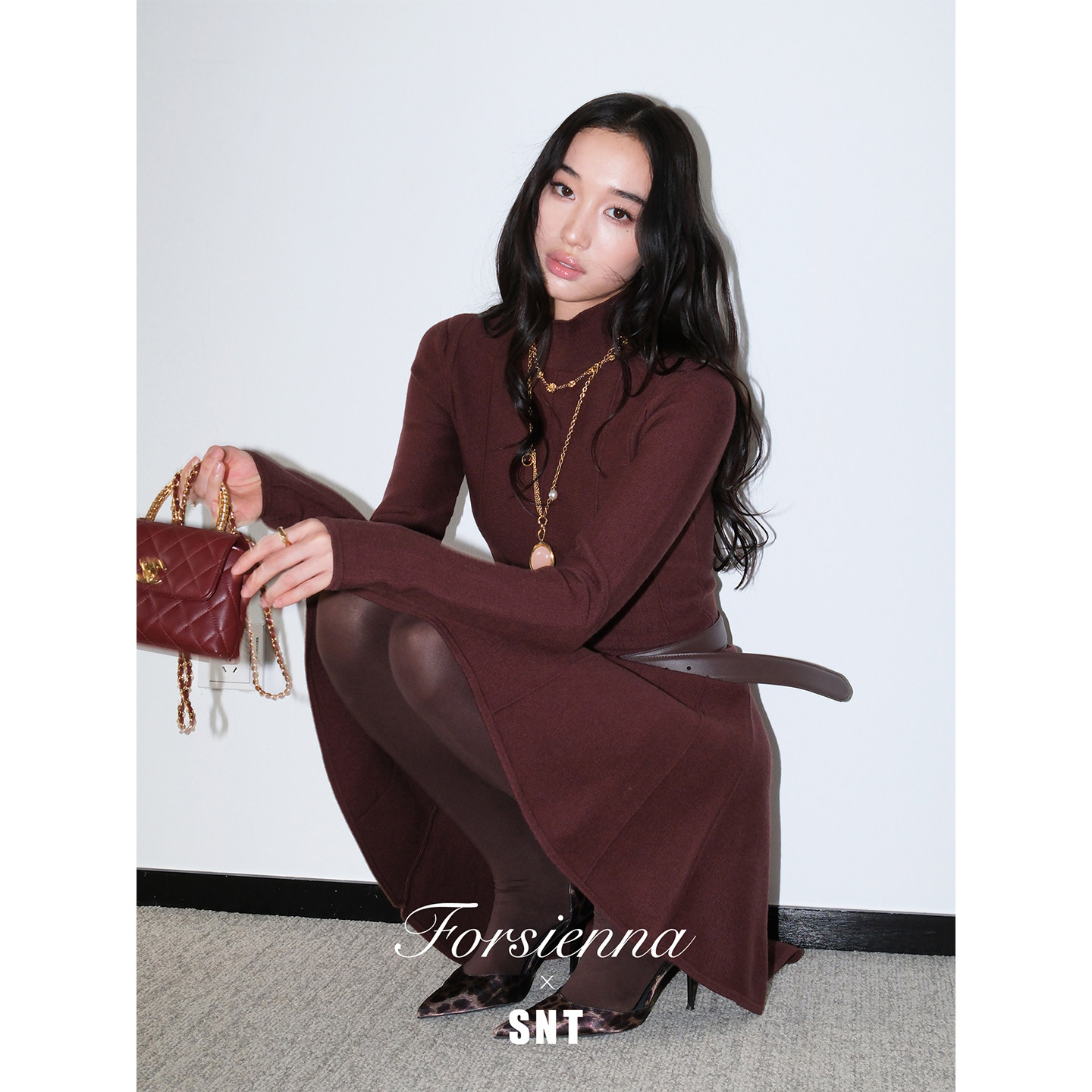 - 酒红色针织连衣裙