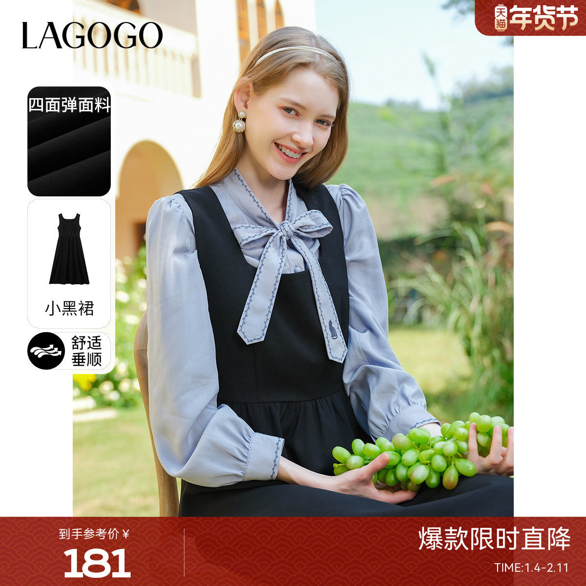LAGOGO黑色简约淑女连衣裙女拉谷谷春季新款正装面试学院风背心裙