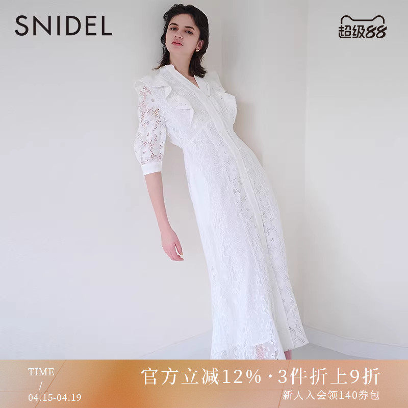 SNIDEL春夏款优雅淑女V领蕾丝荷叶边收腰连衣裙SWFO231225