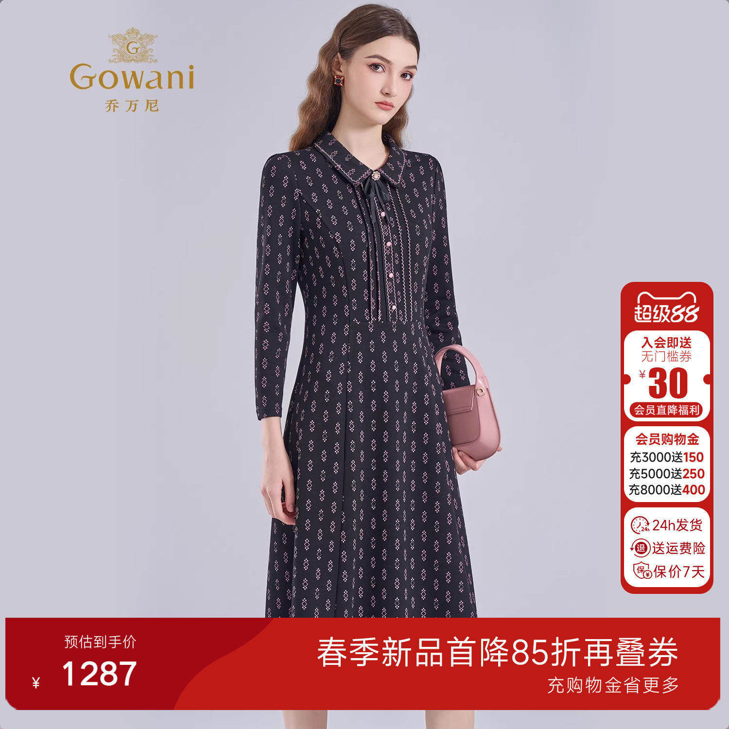 乔万尼淑女风几何印花连衣裙翻领长袖收腰气质通勤中长裙ED4E716