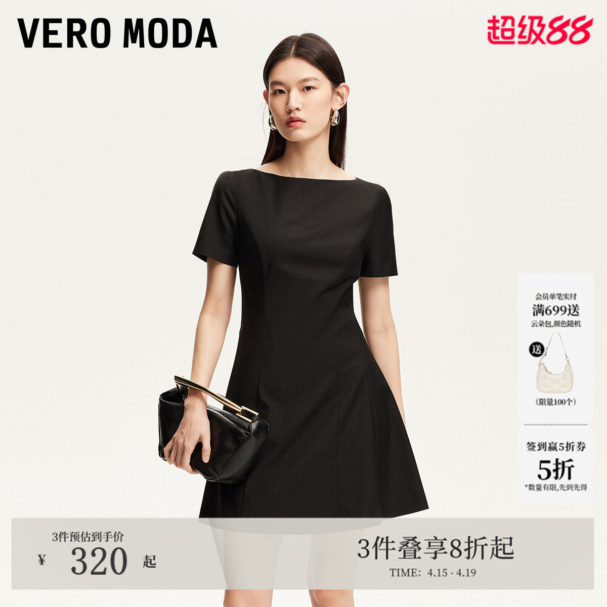 Vero Moda连衣裙25夏季收腰修身立体剪裁A摆短袖小黑裙淑女风