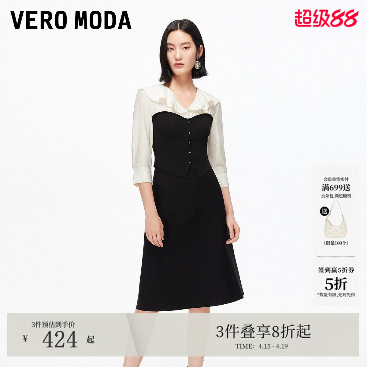 Vero Moda连衣裙2026春夏拼接收腰荷叶边中长裙淑女风325346015