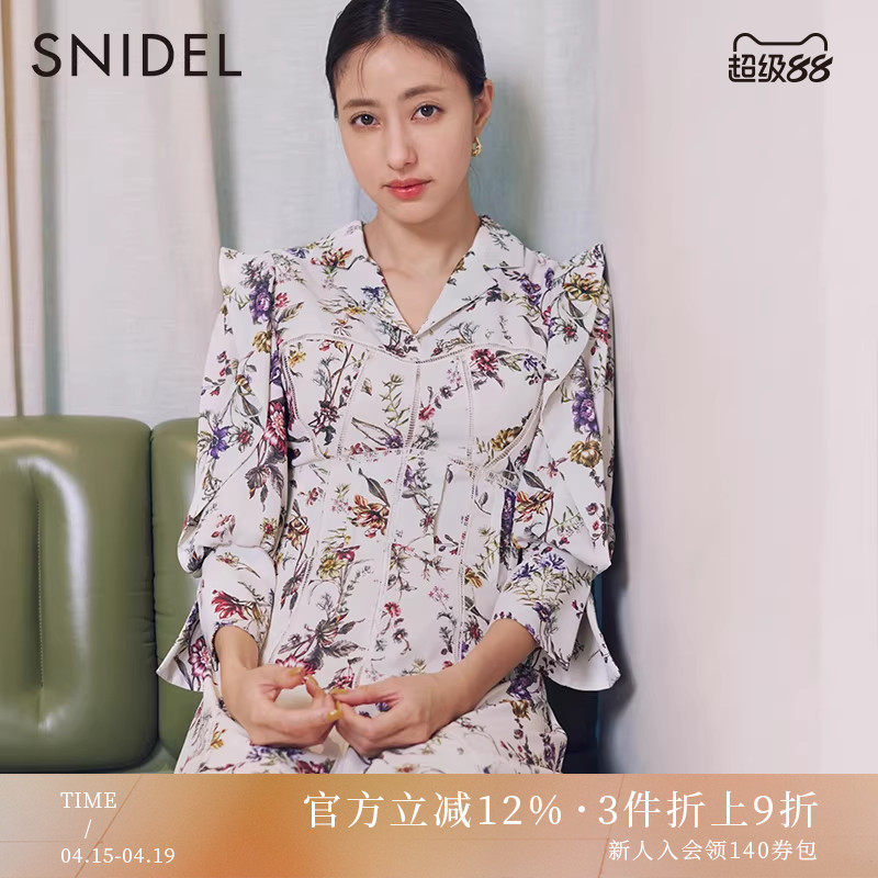 SNIDEL春夏款优雅淑女泡泡袖亮片雪纺印花连衣裙SWFO251088