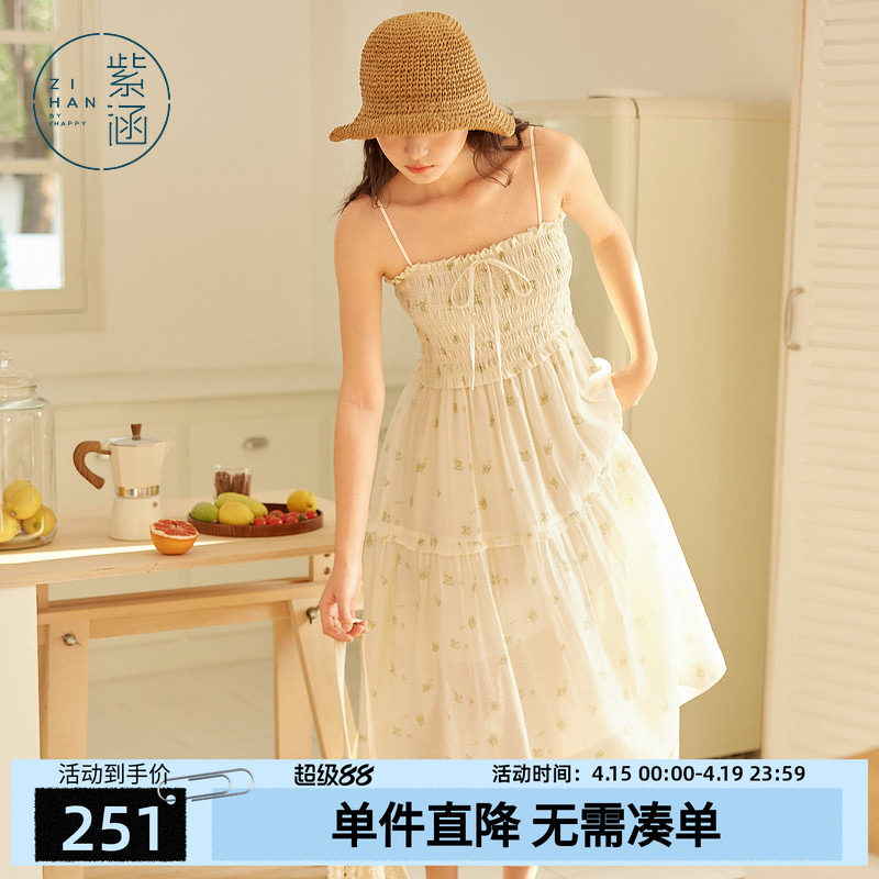 紫涵打揽碎花吊带连衣裙女士夏季新款法式甜美淑女收腰拼接蛋糕裙