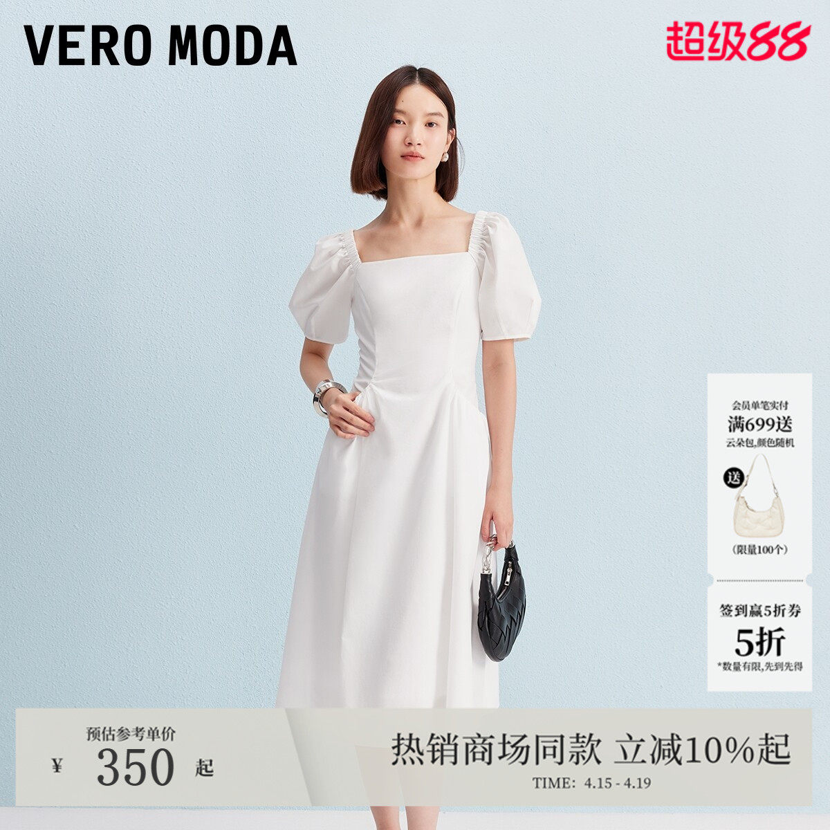 Vero Moda连衣裙2026春夏淑女风方领泡泡袖收腰A字裙32537B001