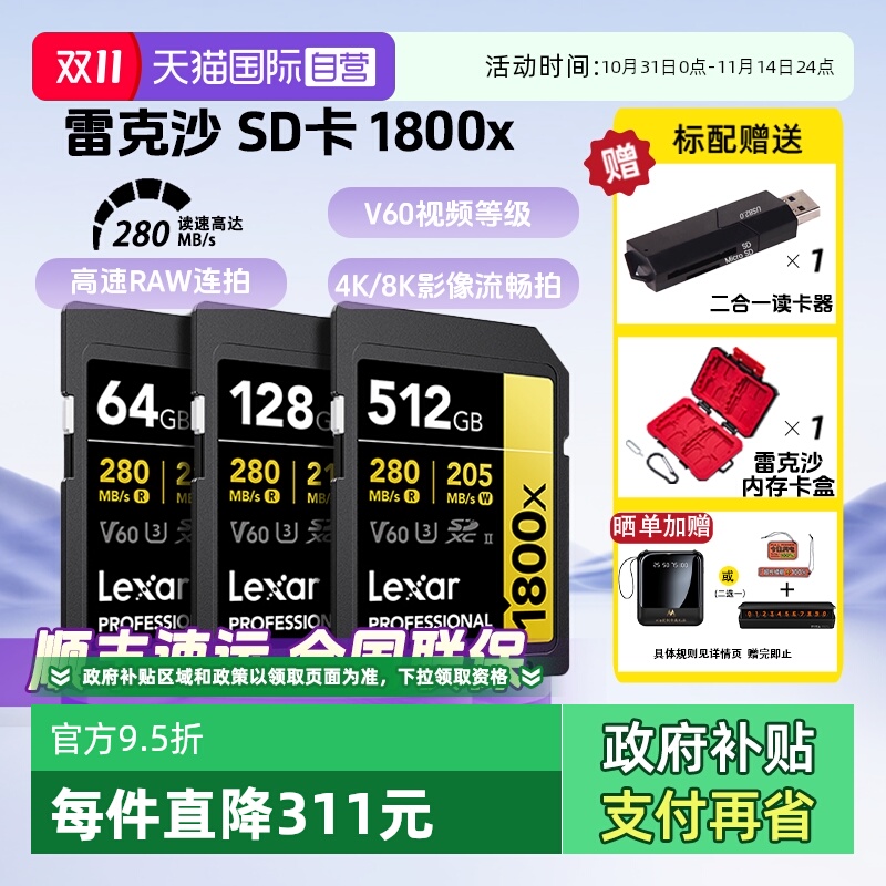 【自营】雷克沙Lexar1800xSD卡64g128g256g相机内存卡高速内存储