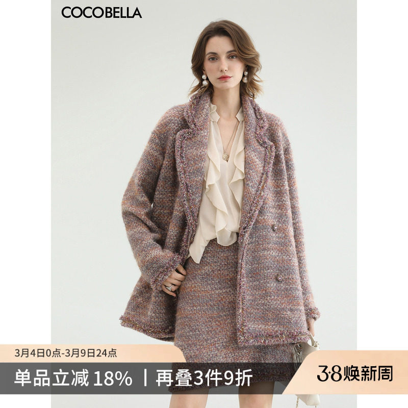 COCOBELLA奢感小香风毛呢外套女新款粗花呢中长款醋酸大衣WL3226