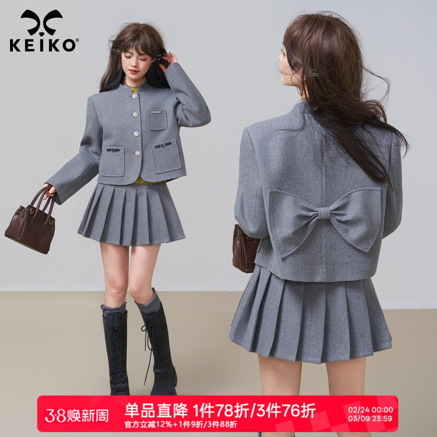 KEIKO 格雷系灰色毛呢外套两件套装女春季智性通勤小立领短款大衣