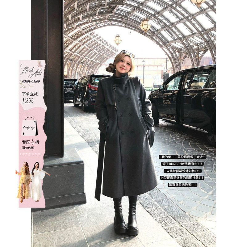 安妮不火 格雷系双排扣毛呢外套女2025秋冬新款微胖大码呢子大衣