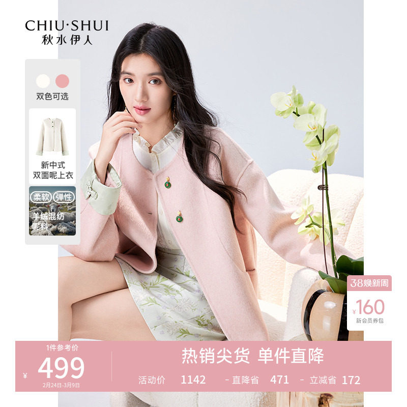 秋水伊人新中式双面毛呢外套2025冬新款女国风提花拼接羊毛短大衣