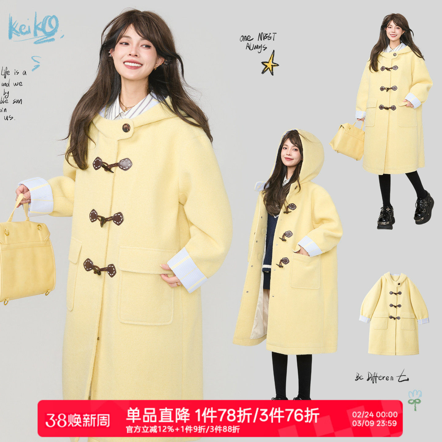 KEIKO 奶黄色牛角扣毛呢大衣女冬季法式学院风宽松中长款连帽外套