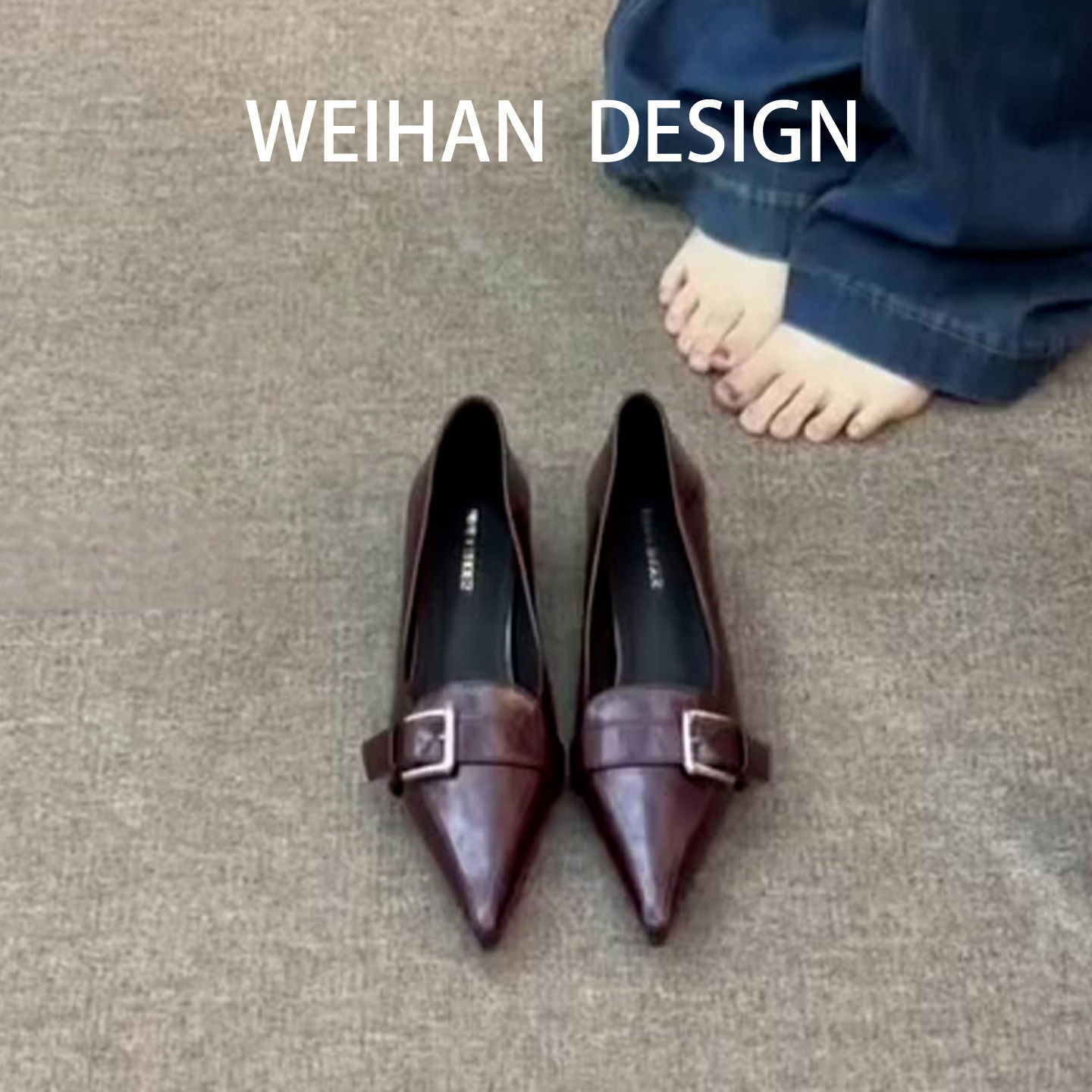 羊皮版!高级感尖头浅口粗跟单鞋皮带扣通勤奶奶鞋软底配裙子瓢鞋