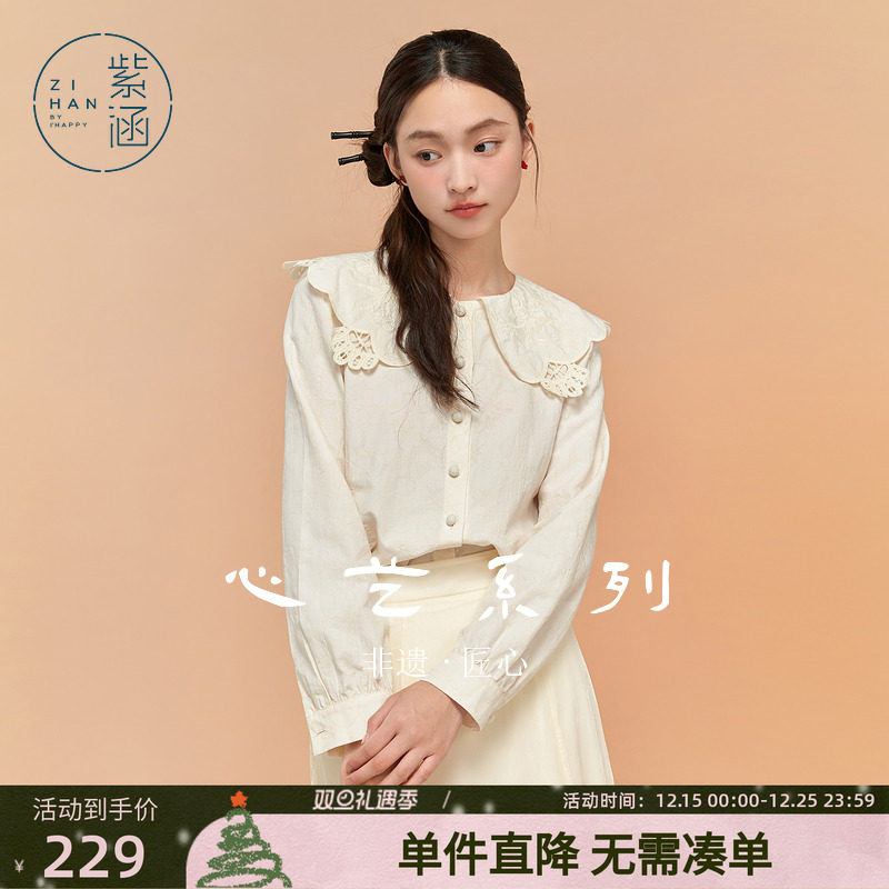 紫涵刺绣长袖衬衫女冬季新款甜美学院风100%纯棉简约百搭领带上衣
