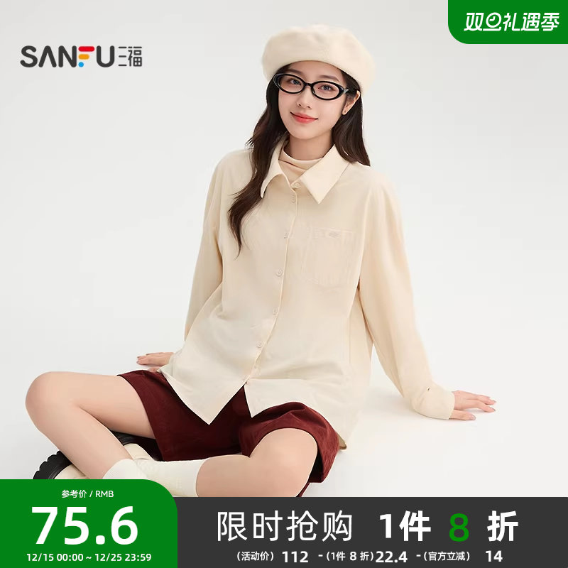三福长袖衬衫女2025新款秋季简约翻领灯芯绒衬衣法式宽松上衣女装