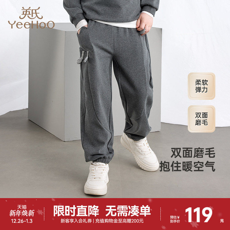 幼悠男童2025新款纯色复合一体绒运动裤秋季宽松加厚保暖儿童长裤