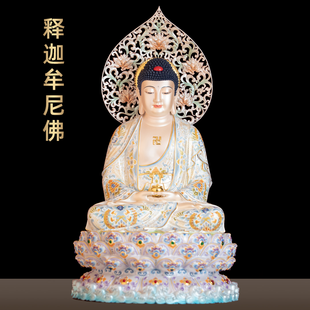 全铜彩绘释迦牟尼佛摆件如来佛娑婆三圣释迦摩尼佛像家用佛堂供奉