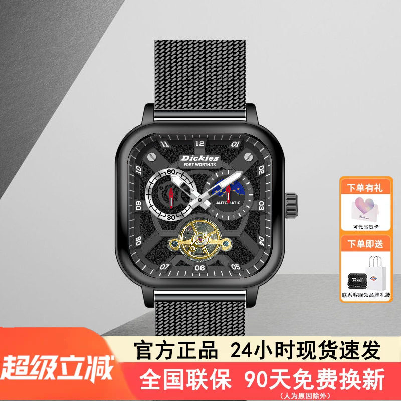 Dickies官方正品手表男潮方形全自动机械陀飞轮镂空学生防水腕表
