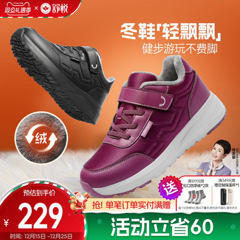 舒悦老人鞋女冬季加绒保暖防滑软底轻便中老年健步旅游妈妈鞋母亲