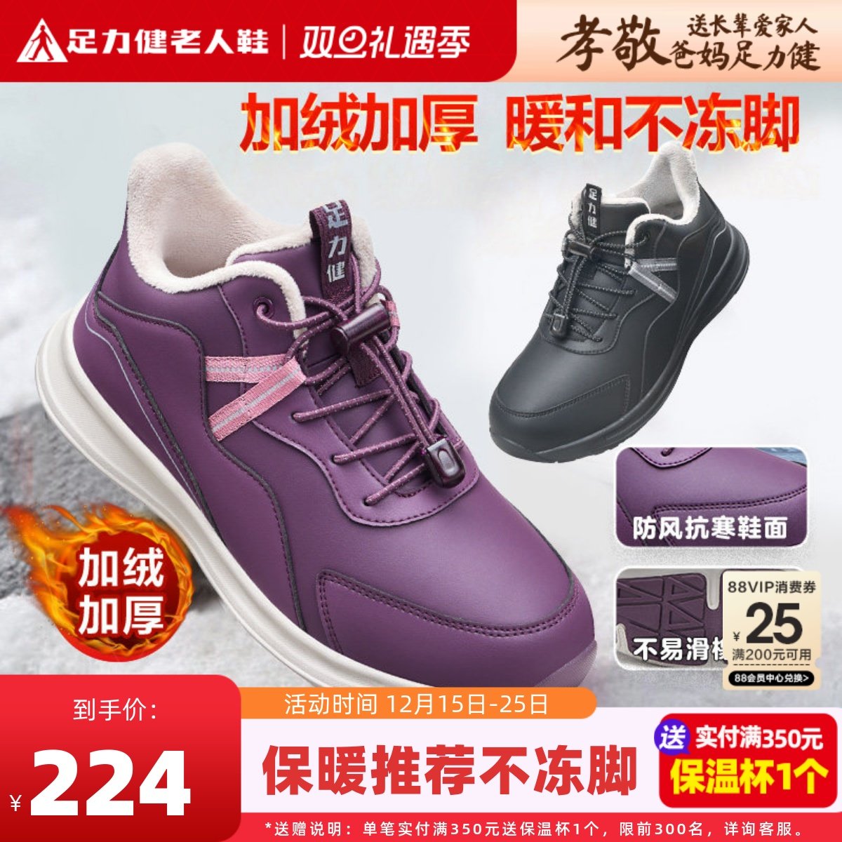 足力健老人鞋正品加绒棉鞋冬季健步鞋中老年保暖鞋棉靴皮面防滑鞋
