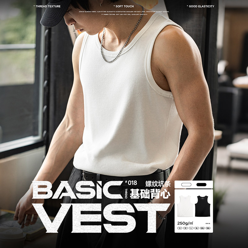 夏季美式重磅粗螺纹背心男230g显大健身打底透气弹力修身坎肩无袖