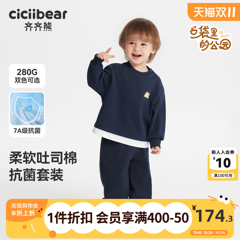 [7A抗菌]齐齐熊宝宝假两件卫衣套装男童秋装2025新款儿童户外童装