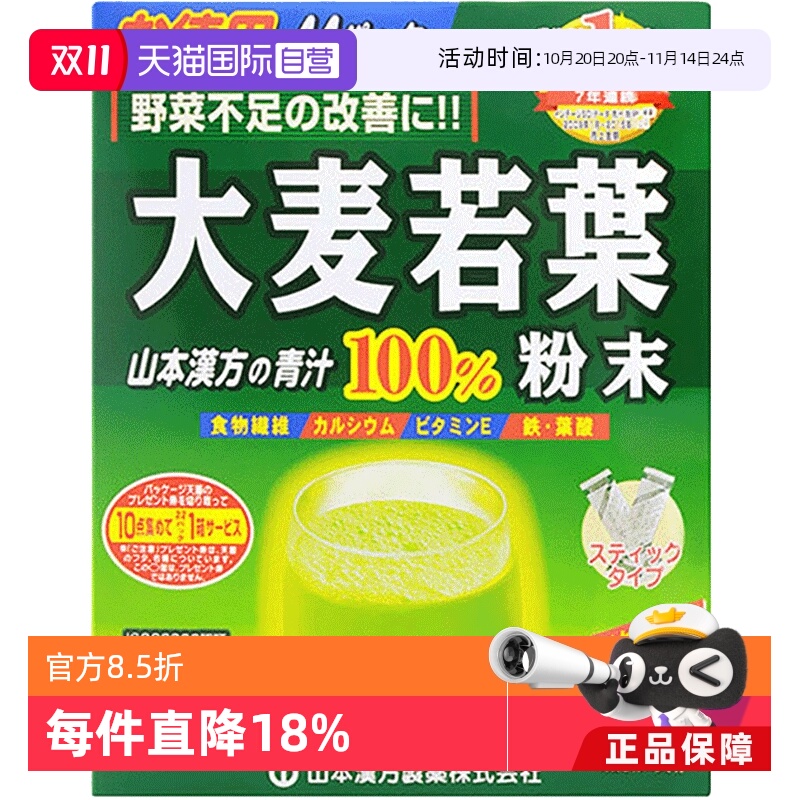 【自营】日本山本汉方大麦若叶青汁果蔬膳食纤维粉抹茶粉 3g*44袋