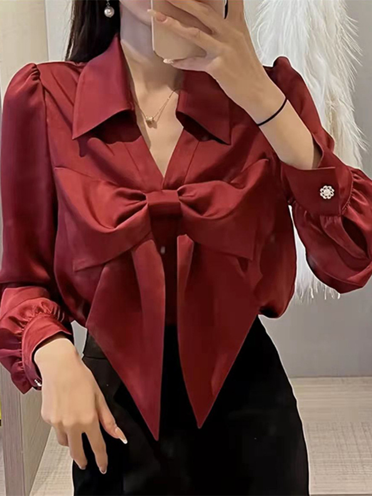 2025年春秋新款雪纺衬衫上衣蝴蝶结系带翻领衬衫女士百搭衬衣长袖