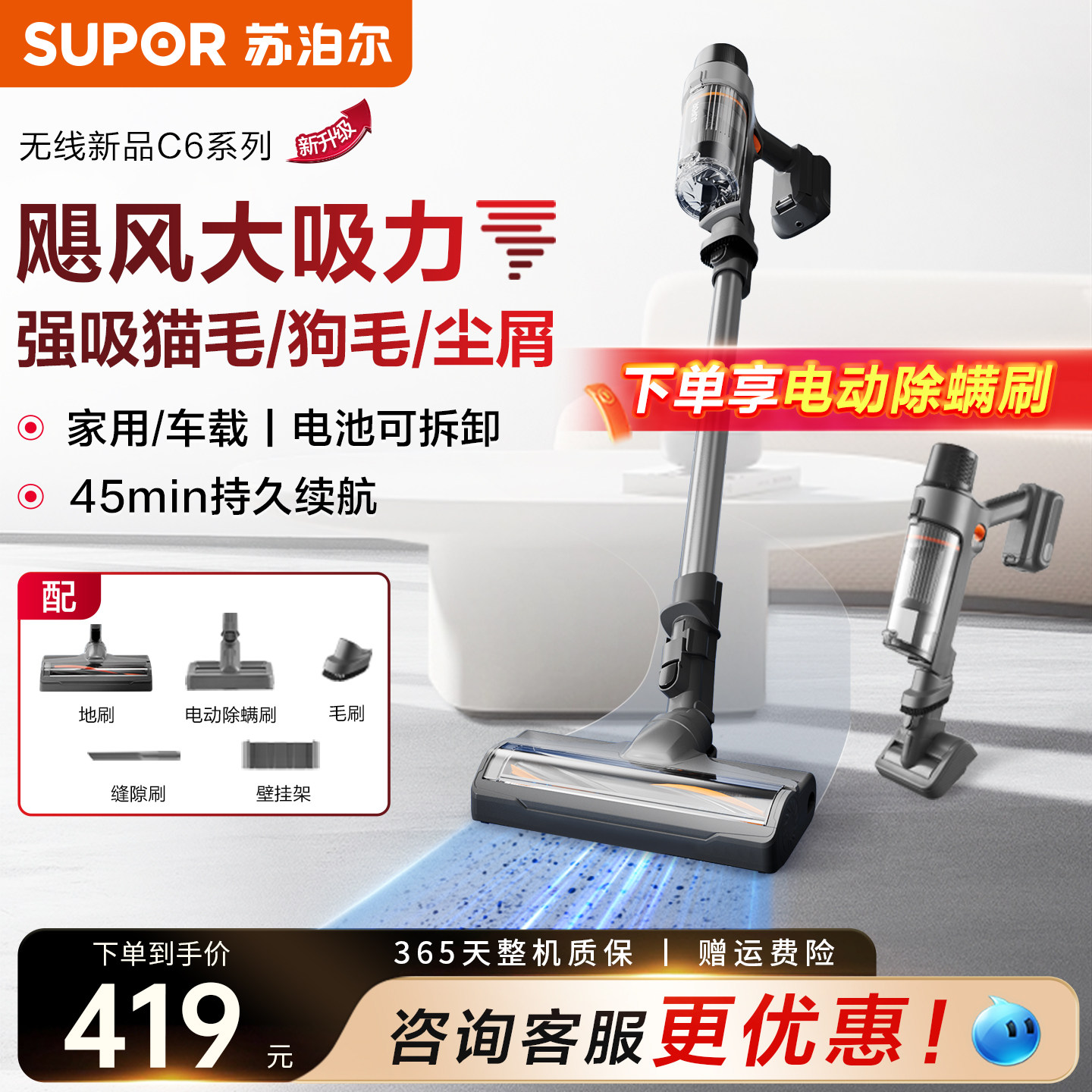 苏泊尔无线吸尘器家用大吸力手持式吸猫毛地毯吸尘机小型2025新款