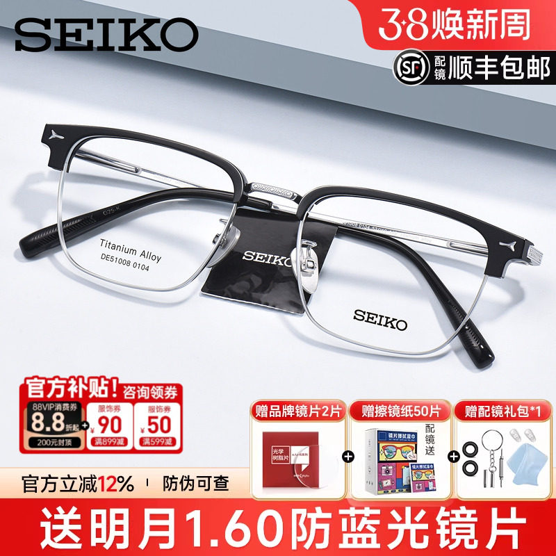 SEIKO精工眼镜框男轻奢商务超轻钛架眉线半框可配近视度数DE51008
