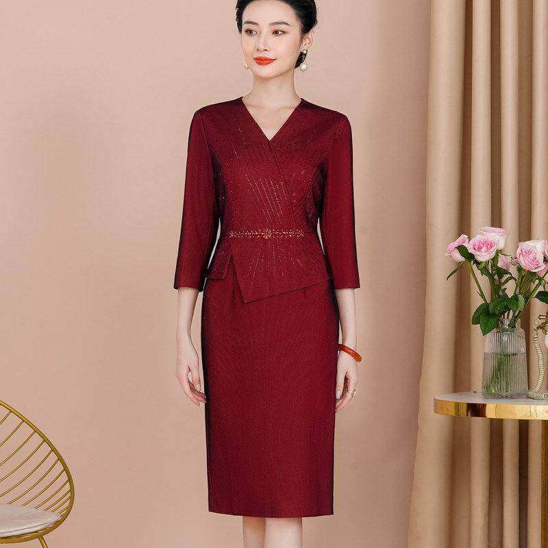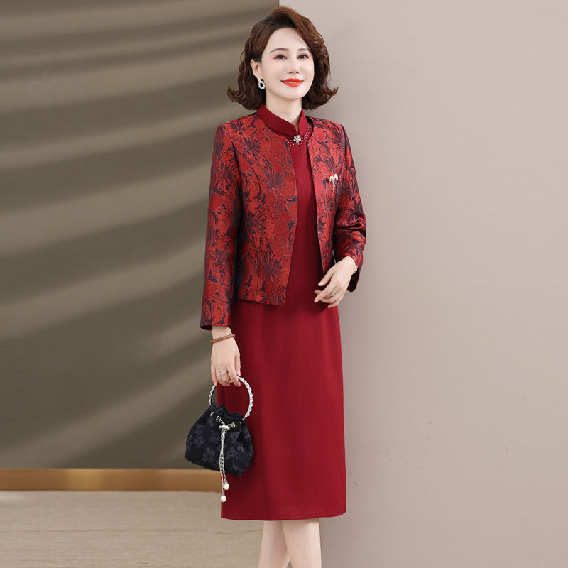 妈妈婚宴装高贵礼服连衣裙套装春秋装新款喜婆婆国庆婚礼服红裙子