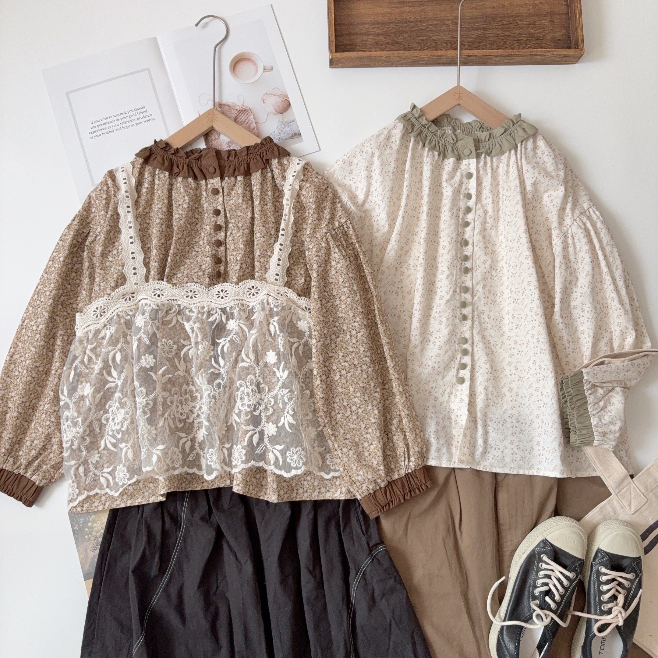 文艺森系蕾丝花边立领长袖衬衫女春秋款复古磨毛碎花宽松休闲上衣