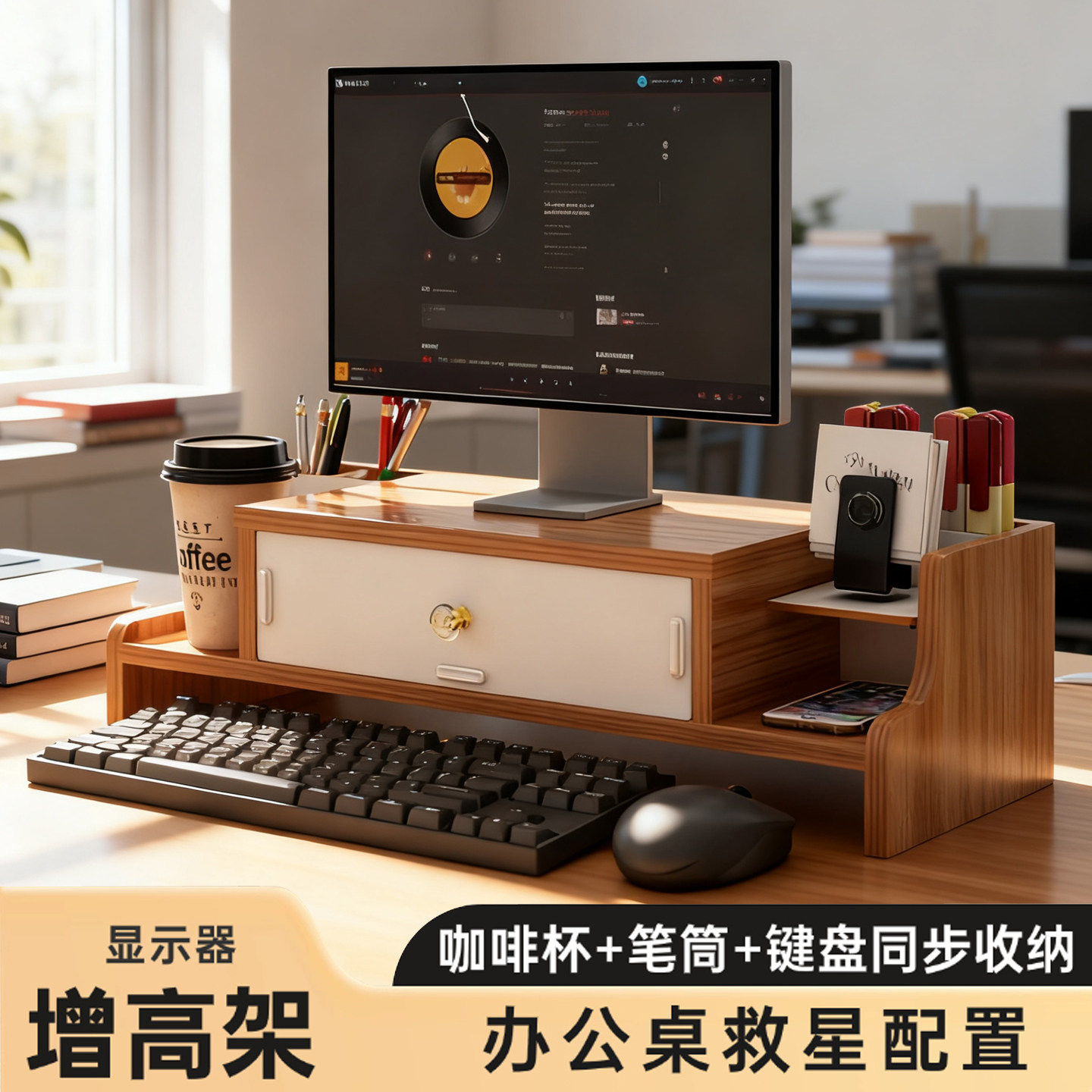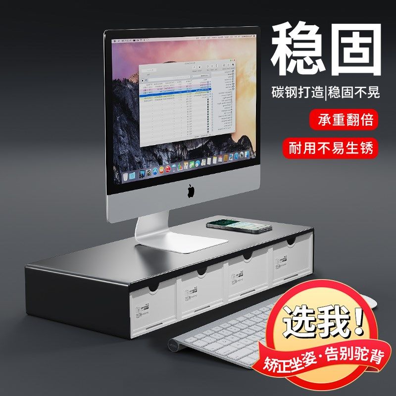 电脑增高架子带抽屉办公室台式屏幕抬高支架加厚桌面收纳盒免安装