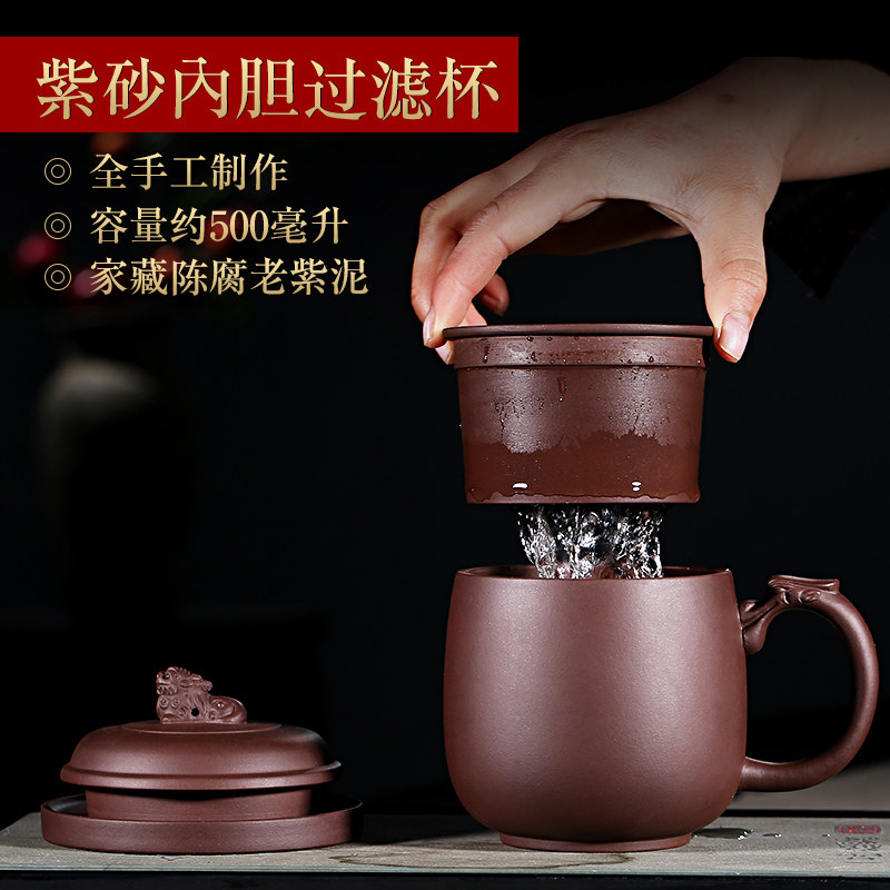 宜兴紫砂杯内胆过滤茶杯带盖杯子原矿全手工茶具紫泥隔舱杯龙貔貅