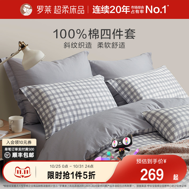 罗莱家纺旗舰店床上用品100支全棉简约四件套纯棉床单被套套件