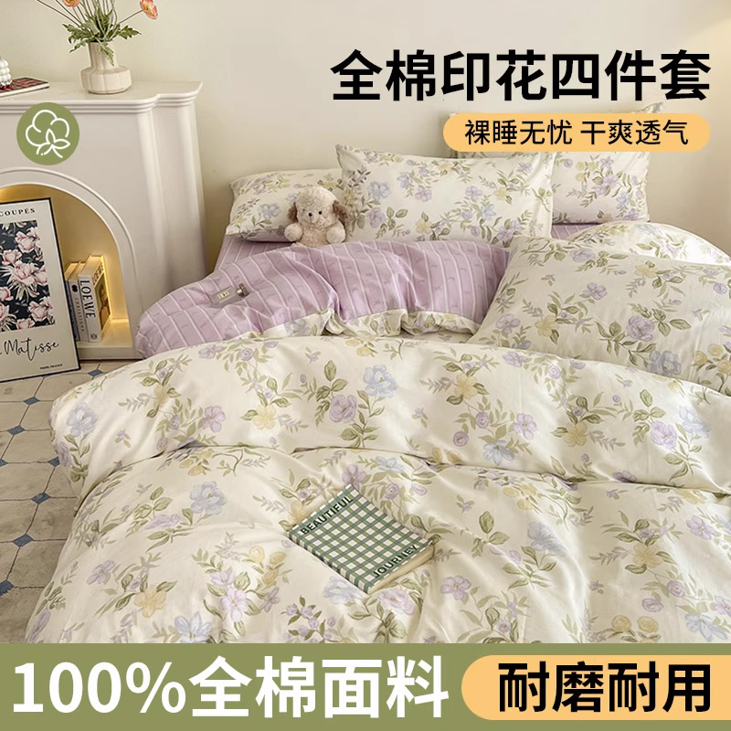 紫罗兰全棉小清新印花简约四件套纯棉床单被套床品学生宿舍三件套