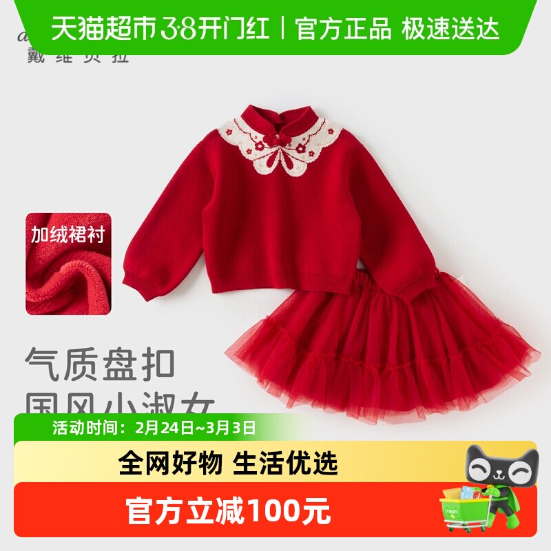 戴维贝拉女童国风红色半裙套装2026秋冬新款中大童新中式两件套