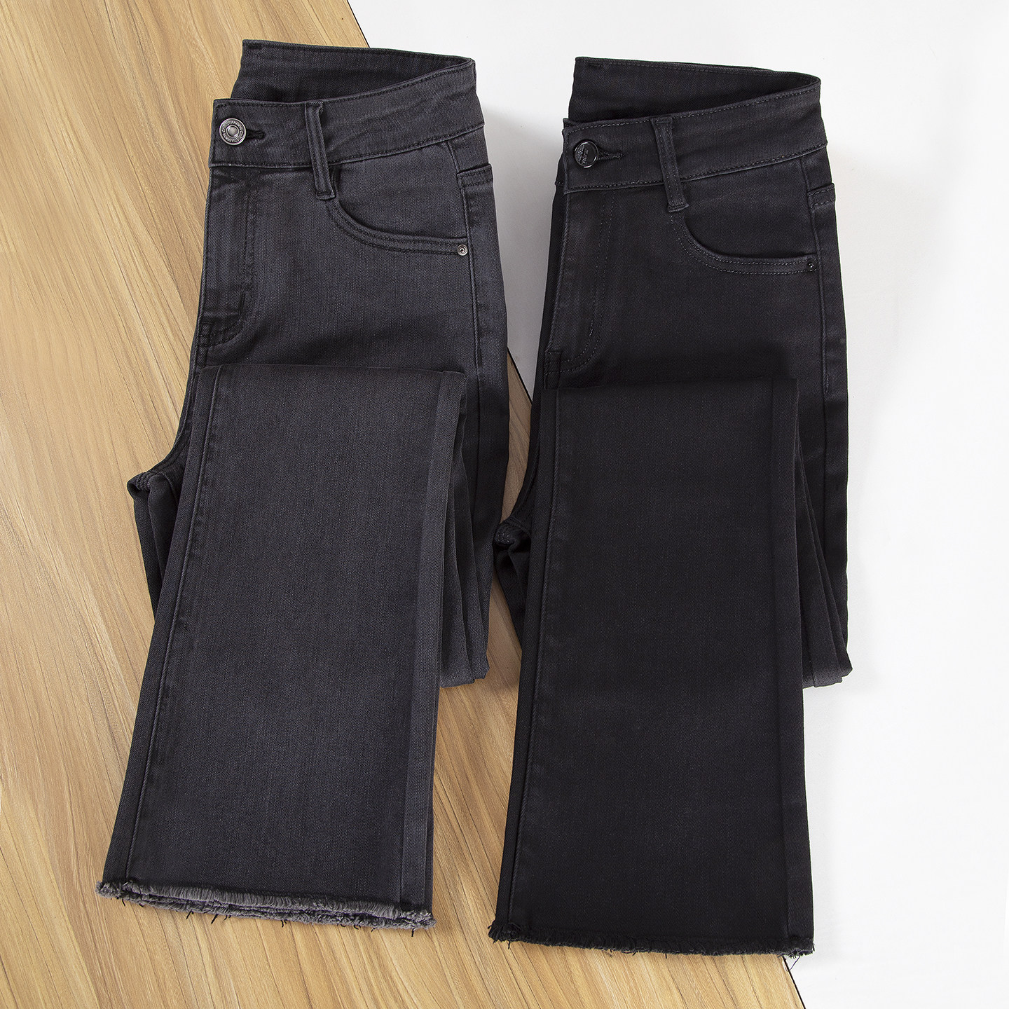 微喇叭牛仔裤女秋冬季加绒黑色毛边高腰显瘦小个子七八九分喇叭裤
